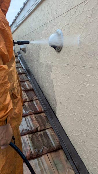 足場が組み上がったら、外壁や屋根、付帯部の高圧洗浄を行います。