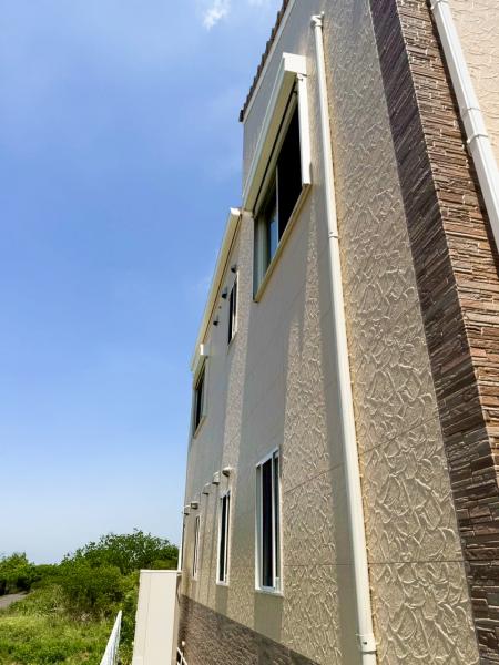 外壁全体の色褪せが進んでいました。紫外線や雨風にさらされることで、塗膜の防水性が低下し、表面が粉っぽくなるチョーキング現象も見られました。